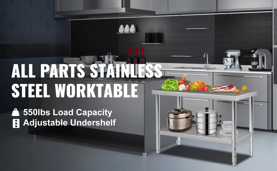 Heavy-Duty Work Table: Our stainless steel prep table has an undershelf for additional storage space. The top shelf can load max. 330 lbs / 150 kg items, and the undershelf can load max. 220 lbs / 100 kg items. It’s easy for you to store all of your most-used supplies. The 0.6 inch / 15 mm upgraded density board and 1.9 inch / 48 mm thickened columns improves both the durability and stability of this table.