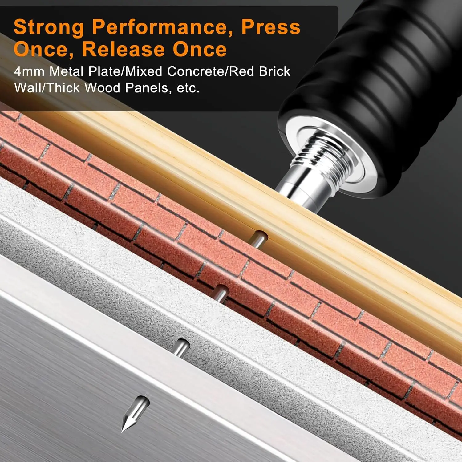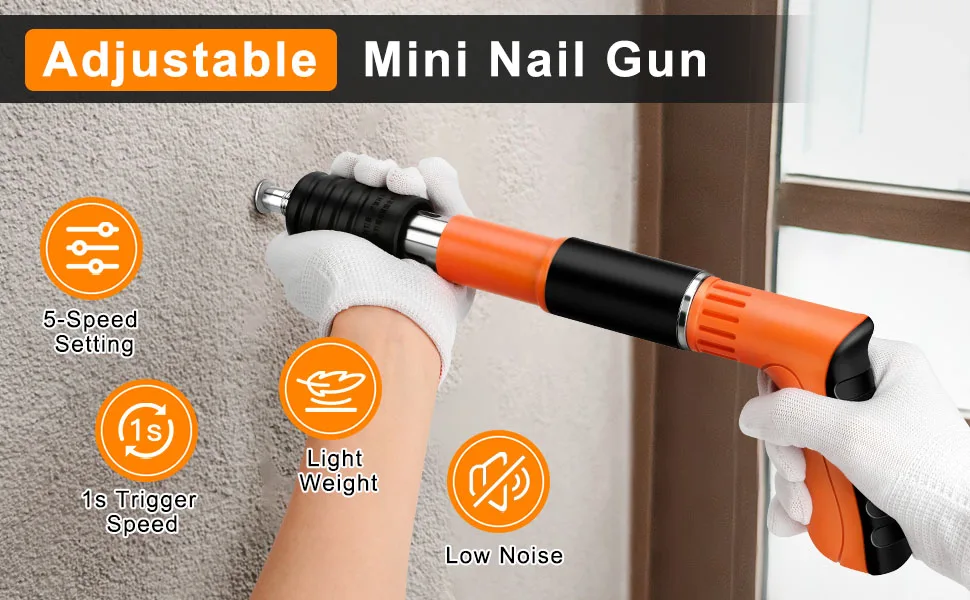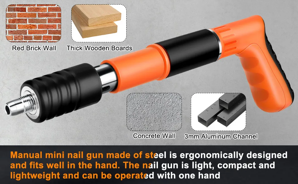 Esta pistola de pregos para concreto possui 5 marchas ajustáveis para lidar com vários materiais sem esforço - desde placas de aço de 3 mm até paredes de tijolo e tábuas de madeira - proporcionando controle preciso para diferentes projetos.